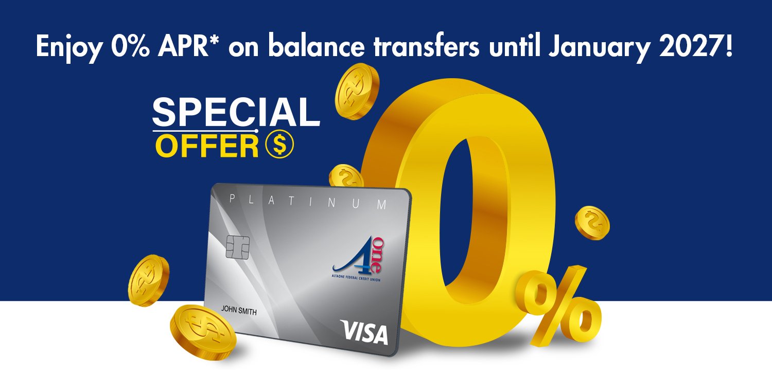 Apply for an AltaOne Visa® Platinum Credit Card and enjoy 0% APR* on balance transfers until January 2027.